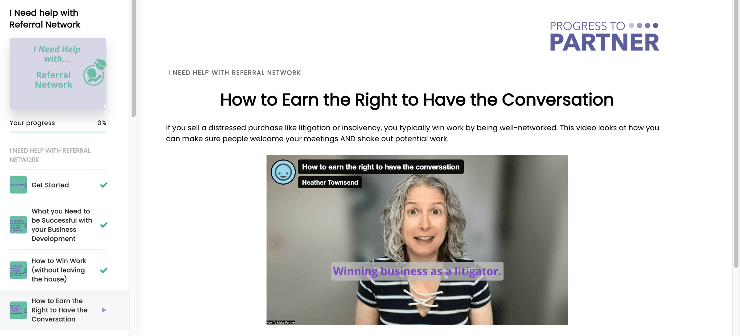 There are 14 courses in Progress to Partner Academy – videos and workbooks to help you build the skills you need to make progress in your career in your firm. Progress to Partner’s courses include “How to become the Go-To-Expert”. We also have Game Plan called “…if you need to raise your profile” with sections on raising your profile inside your firm as well as externally. Check it out!